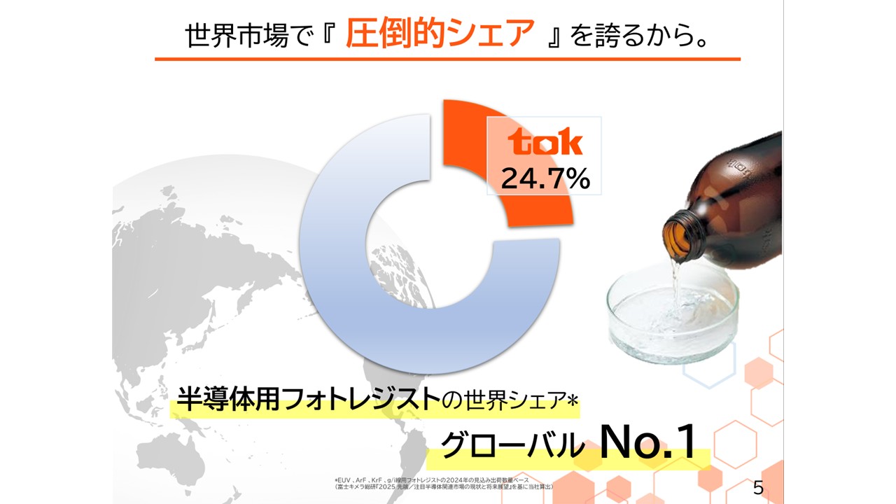 スライドは、当社グループの売上高、営業利益、EBITDAの推移を表したグラフです。売上高は2019年12月に1,000億円を超え、そこから2023年の半導体市場の生産調整による落ち込みがありましたが、2024年度は2019年に比べ、売上高は約2倍、営業利益は約3倍超の成長を達成しました。これからも長期ビジョン「tok Vision 2030」で掲げた、売上高3,500億円、EBITDA770億円の達成に向けて、半導体用レジストや高純度化薬品のグローバルシェアのさらなる拡大によって、成長軌道をしっかりと歩んでいきたいと思います。