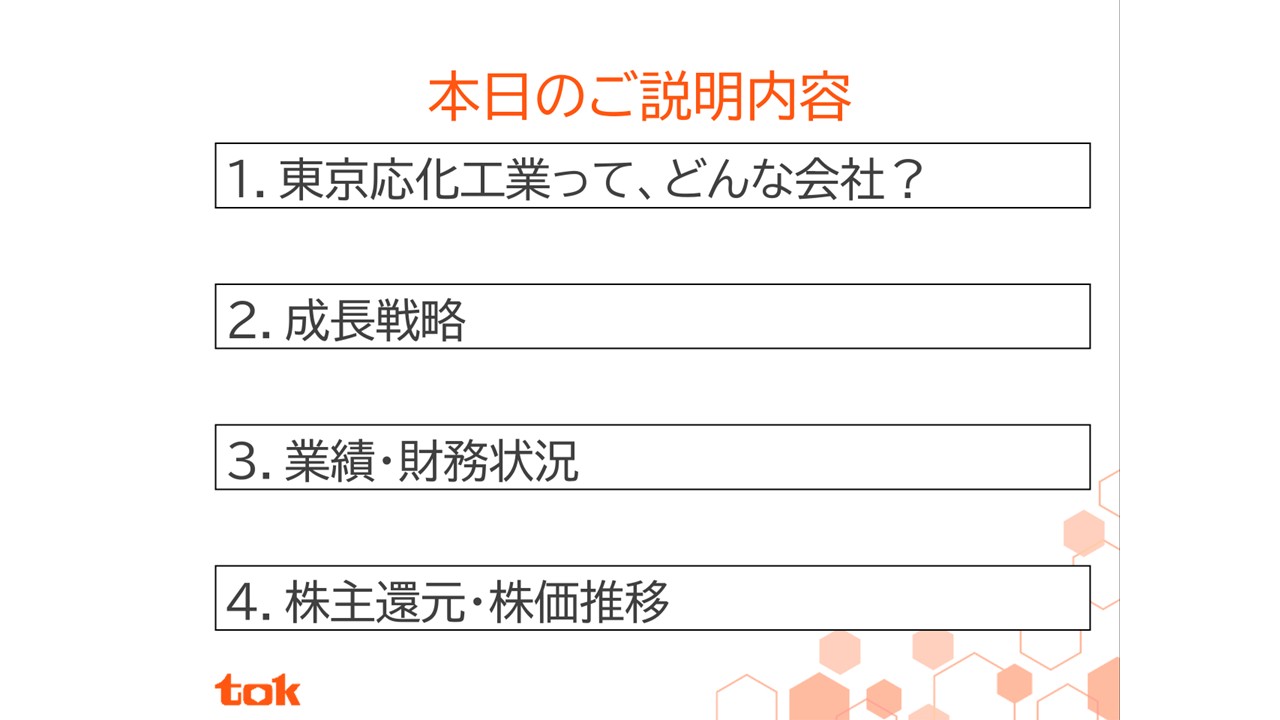田宮課長(以下、田宮):本日は東京応化工業を4つの項目に分けて説明いたします。まずはじめに、東京応化工業の概要についてです。