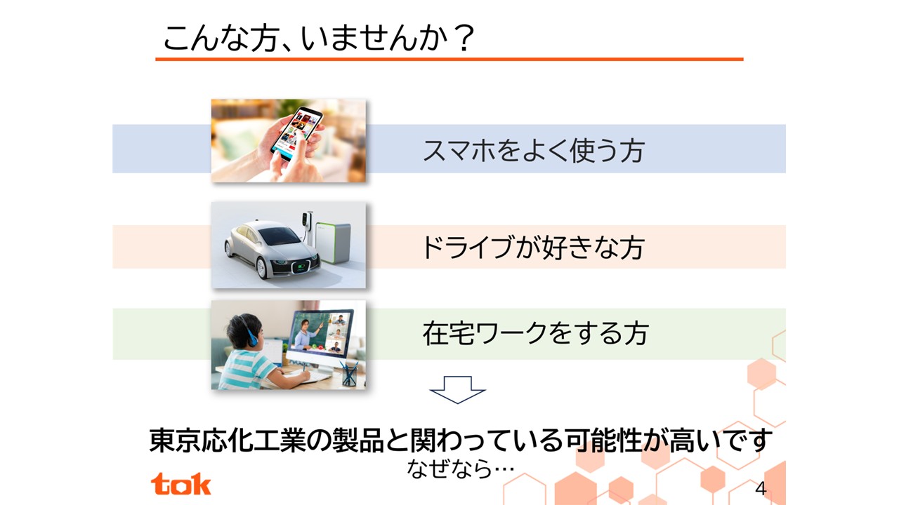 会社概要をお話しする前に、1つ質問をさせてください。皆様の中にこんな方はいらっしゃいますでしょうか?スマートフォンをよく使う方、愛車でドライブをすることが好きな方、在宅で仕事をされている方、そんな方々は当社の製品と間接的に関わっている可能性が非常に高いです。