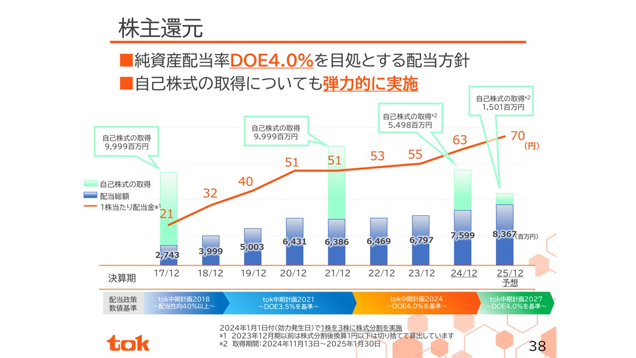 当社は、当社株式の流導性の向上及び投資家層の拡大を図ることを目的として、2024年1月に1株につき3株の割合を持って株式分割を実施しました。当社は中長期で応援してくださる株主の皆様に対して、安定的かつ継続的な利益還元でお答えしたいと考えています。そこで、2018年12月期の期末配当より、配当方針を配当性向から純資産配当率DOEに変更しました。現在、DOE4%を目途とする配当方針に基づき、2025年12月期は年間配当70円を予想しており、8期連続の増配となる見込みです。また、2024年11月から2025年1月にかけて、総額70億円と自社株買いを実施しました。自社株買いについては、半導体市場の需要を見越した設備投資、成長投資にキャッシュを投下した上で、弾力的に実施してまいります。株主還元については、これからも積極的に取り組むことで、皆様のご期待に応えていきたいと思っています。
