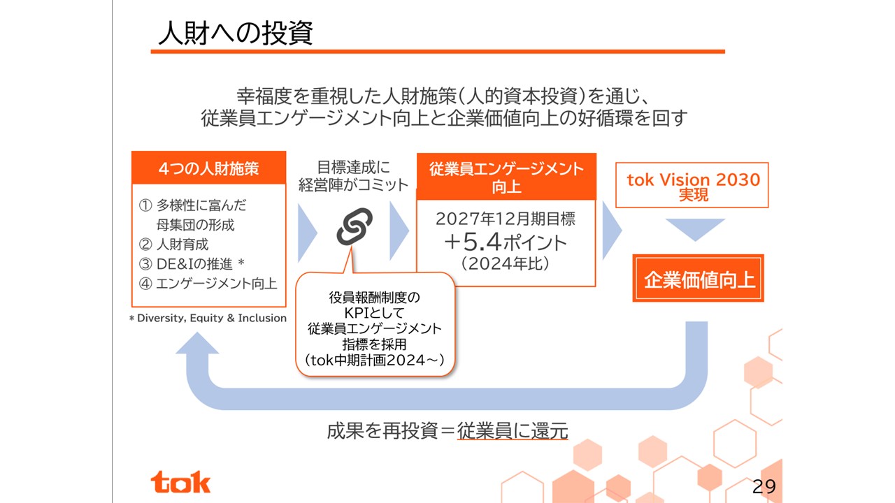 4つ目の成長の鍵は、当社の進化には生産拠点の多角化だけではなく、人財への投資が不可欠であると考えています。そこで当社グループは、人財の幸福度の追求をマテリアリティとして設定し、4つの人財戦略、多様性に富んだ母集団の形成、人財育成、DE&Iの推進、エンゲージメントの向上を推進しています。特にエンゲージメントの向上は、役員報酬制度のKPIとして従業員エンゲージメント指標を採用し、企業価値を向上させ、その成果を従業員に還元するサイクルを回す好循環を加速してまいります。