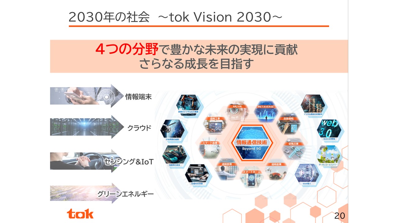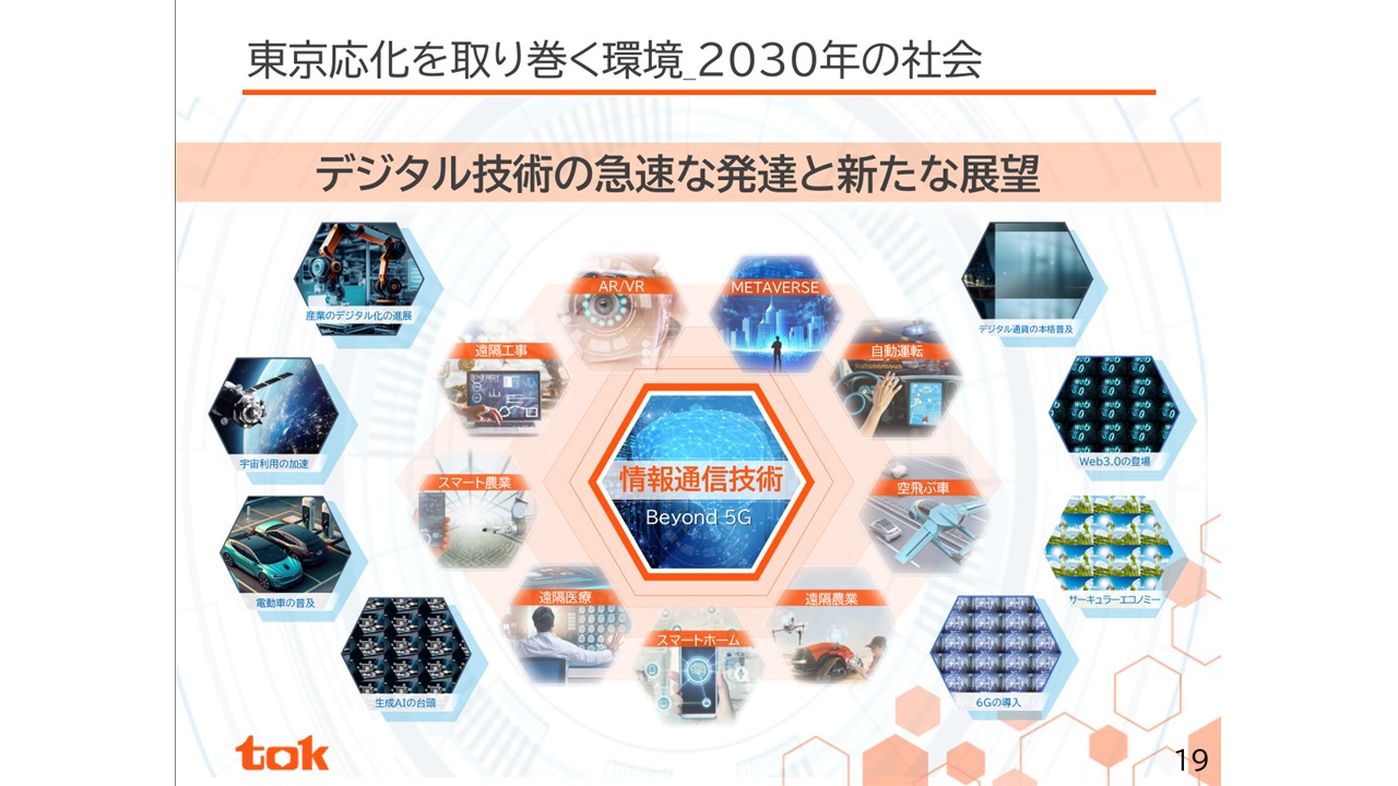 スライドは当社グループの長期ビジョンである「tok Vision 2030」の前提となる新たな社会環境の一端を示したものです。生成AIが世界に新たな価値を生み出そうと動き始める中、社会環境の変化の中心は半導体に支えられるデジタル技術であり、新たな世界の可能性が2030年へつながっています。