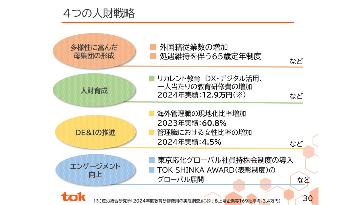 4つの人財戦略に基づく施策例の一部をご紹介します。人員の強化、定年延長制度の導入や教育研修の充実を進めるとともに、DE&Iの推進に向けて性別や国籍関係なく活躍できる環境作りを進めています。また、当社グループの顧客密着戦略は海外で働くグループ従業員によって支えられているため、「TOK SINKA AWARD」という表彰制度の対象を、海外子会社の従業員にも拡大した他、海外子会社の従業員も参加できるグローバル社員向け制度を他社に先駆けて導入しました。