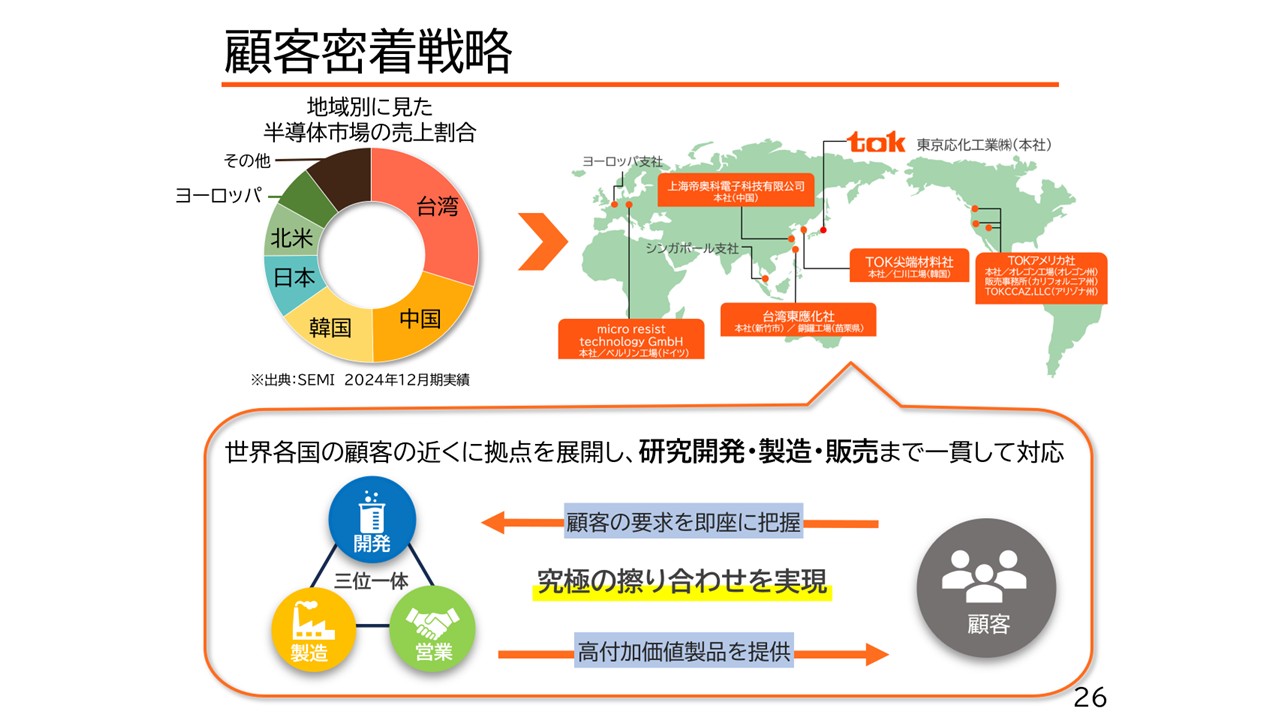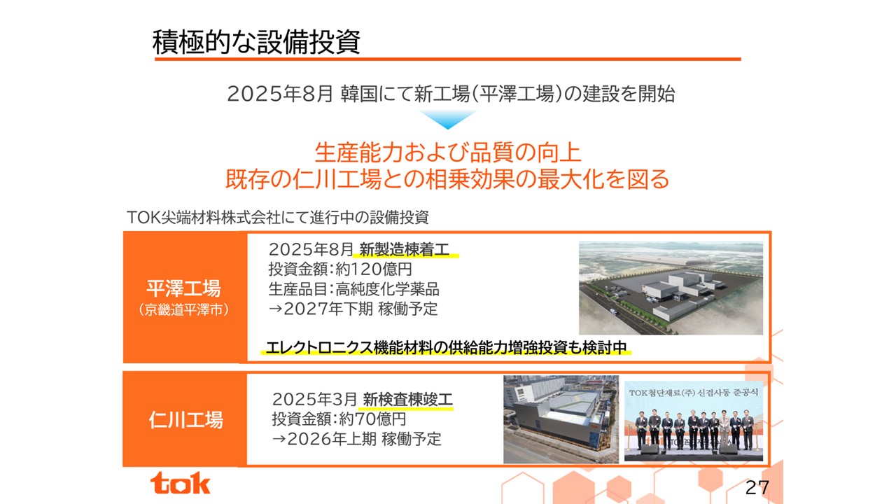 顧客密着戦略に基づき、将来の需要増加に応えるための積極的な設備投資も行っています。当社は8月にリリースした通り、韓国の連結会社であるTOK尖端材料株式会社において、2番目の拠点となる平澤工場を建設します。本投資は、韓国における最先端領域での高純度化学薬品の地産地消の市場ニーズに答えるものであり、今後のさらなる製品ポートフォリオ拡充のため、本投資を軸に韓国における開発、製造、営業の三位一体の顧客密着戦略をさらに強化してまいります。既存の仁川工場では2025年3月に新検査棟が竣工し、生産能力の向上、品質管理の強化に向けて設備導入を進めており、2026年上期に稼働予定となっています。