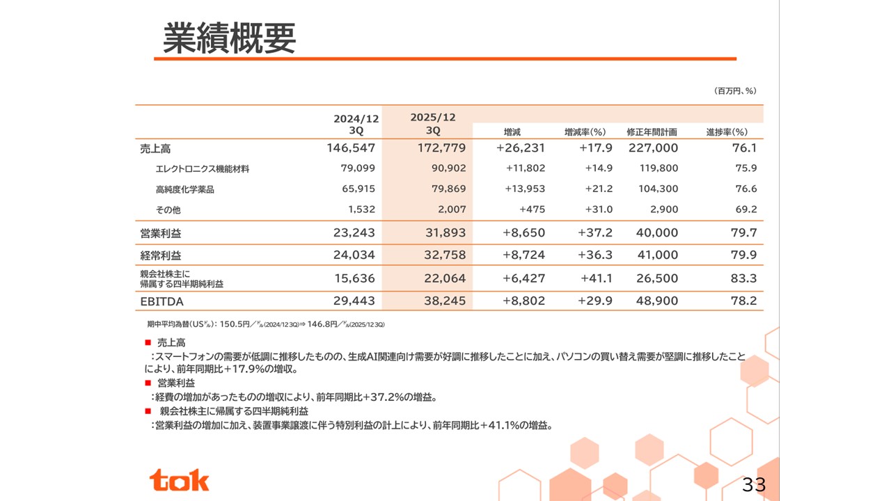 スライドは2025年12月期第3四半期の業績です。当社は12月決算の会社です。2025年12月期第3四半期は、スマートフォンの需要が低調に推移したものの、生成AI関連の需要が好調に推移したことに加え、パソコンの買い替え需要が堅調に推移したことにより、当社製品の売上は好調に推移し、前年度比で大幅な増収増益となっています。今年度の業績予想は、前年度から大幅な増収増益となる売上高2,270億円、営業利益400億円と昨年更新した過去最高業績を更新することを見込んでいます。