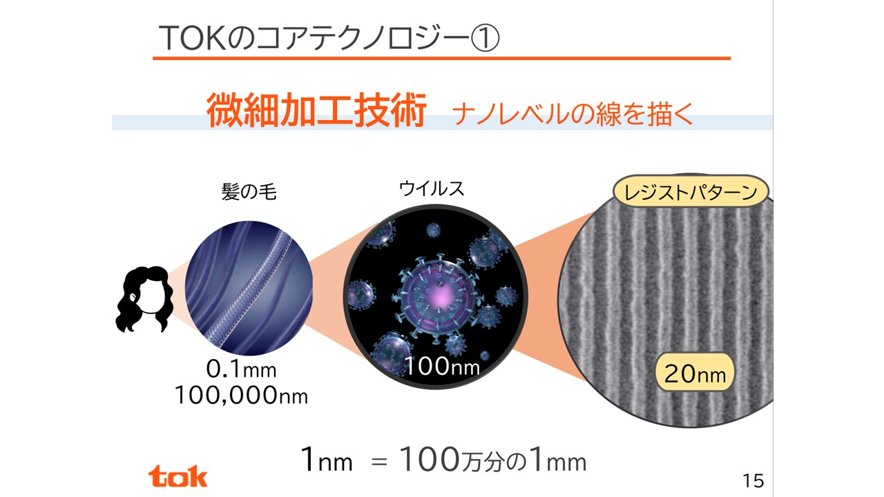 1つ目のコアテクノロジーは、微細加工技術です。半導体はフォトレジストを使って作られた超微細な電子回路によってできています。そもそも半導体の電子回路がどれほど細かいかと言うと、髪の毛の太さはおよそ0.1㎜と言われています。ウイルスの大きさは約100㎚(髪の毛の1000分の1の大きさ)で、ここまで小さいと肉眼では確認することができません。さらに右側のフォトレジストを使って描かれる電子回路は、20㎚(ウイルスの直径の約5分の1の大きさ)で描かれています。最新のスマートフォンでは、これよりさらに微細な大きさで描かれた電子回路が組み込まれています。現在の半導体製造はナノテクノロジーの世界であり、当社はナノテクノロジーの微細加工に必要なフォトレジストを提供しています。