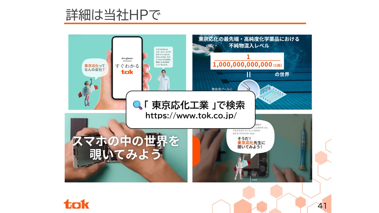 最後に、当社ホームページでは私たちの持つ技術を視覚的に分かりやすく紹介しています。是非、東京応化工業と検索していただき、ページをご覧ください。