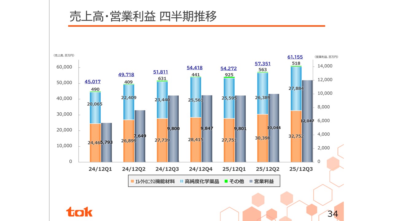 スライドは売上高、営業利益の四半期ごとの推移です。第3四半期3ヶ月間の売上は堅調に推移し、前四半期比からプラス38億円の61億円、営業利益は経費の増加があったものの、売上の増加により前四半期比プラス20億円の120億円となりました。10月から12月の第4四半期についても、顧客の最先端プロセスの量産立ち上げ等により、堅調に推移することを期待しています。