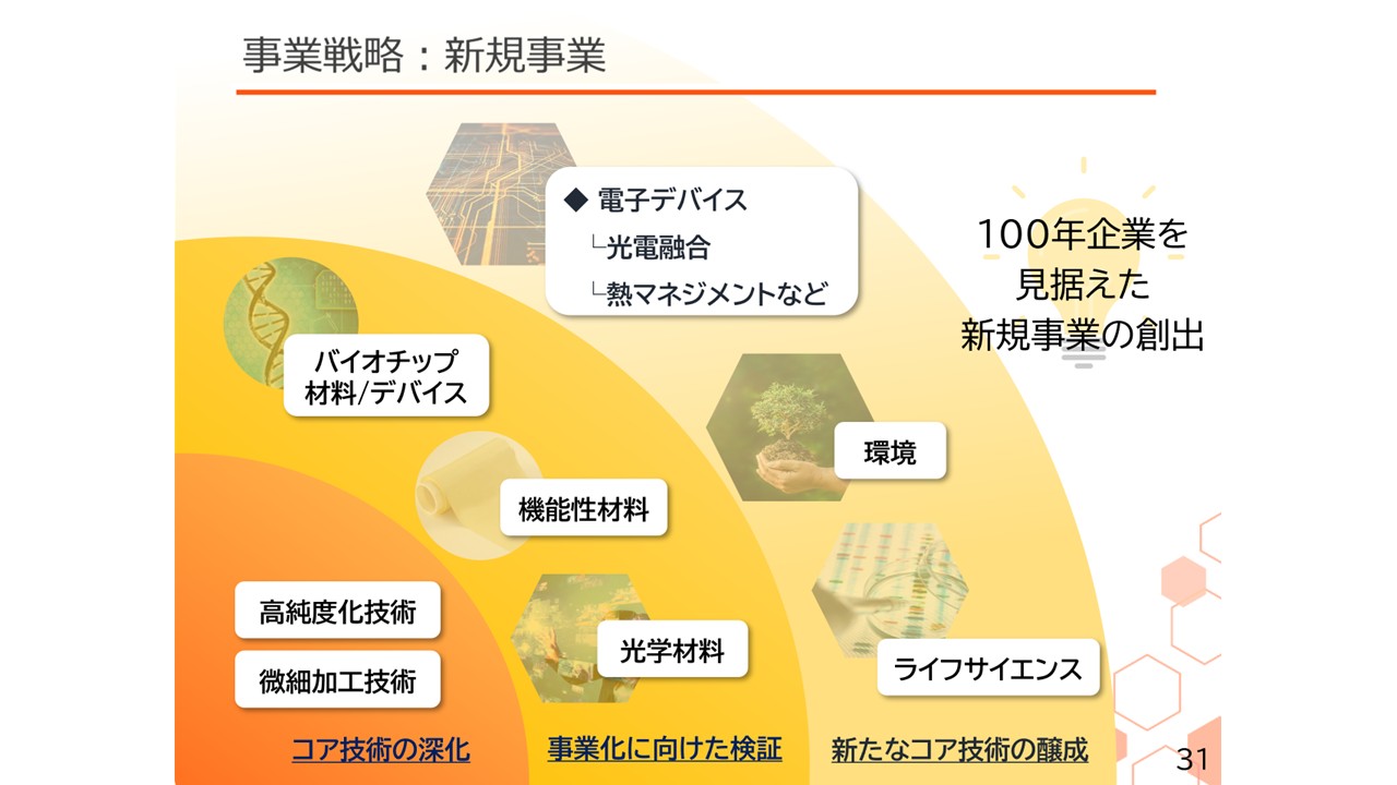 100年企業を見据えた新規事業を創出すべく、微細加工技術、高純度化技術をコア技術として、これまで揃ってきたバイオチップ材料、光学材料、機能性材料といった注力テーマの事業化に向けた検証と外部との協業によるライフサイエンス、電子デバイス、環境などの新たな事業領域の改革に力を入れています。