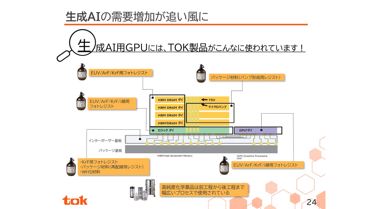 スライドの中央にあるものは生成AIを動かすためのGPUと言われるデバイスの断面です。GPUにはロジック半導体と呼ばれるものやHBMと呼ばれるメモリ半導体が搭載されており、それらが高密度配線層で接続されています。それぞれのユニット、GPUロジック半導体、HBMメモリ、配線層などの製造において、当社のフォトレジストや高純度化学薬品が使われています。例えば、黄色の部分はHBMと呼ばれるDRAMメモリを何枚も積み重ねたメモリ半導体ですが、このDRAMを製造するために当社の最先端のEUVレジストやArFレジストが使用されており、DRAMを積み上げてHBMというメモリ半導体にするために、当社の後工程関連材料のパッケージ材料が使用されています。先ほど半導体市場の成長の牽引役は生成AI関連と申し上げましたが、生成AI関連の需要拡大は当社製品の成長を後押しするドライバーになると確信しています。
