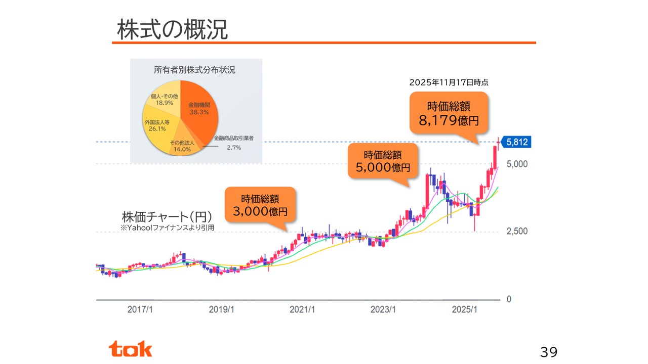 株価は昨日の終値で5,984円で、年初来しっかりと推移しています。時価総額は2020年12月に3,000億円を突破し、2024年2月に5,000億円を突破、11月17日時点の時価総額は8,179億円、昨日の時点では7,594億円となっています。また、当社の株式のうち約19%が個人・その他を含めた株主様となっています。