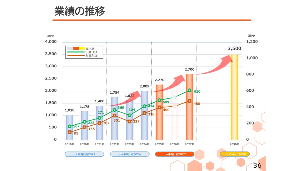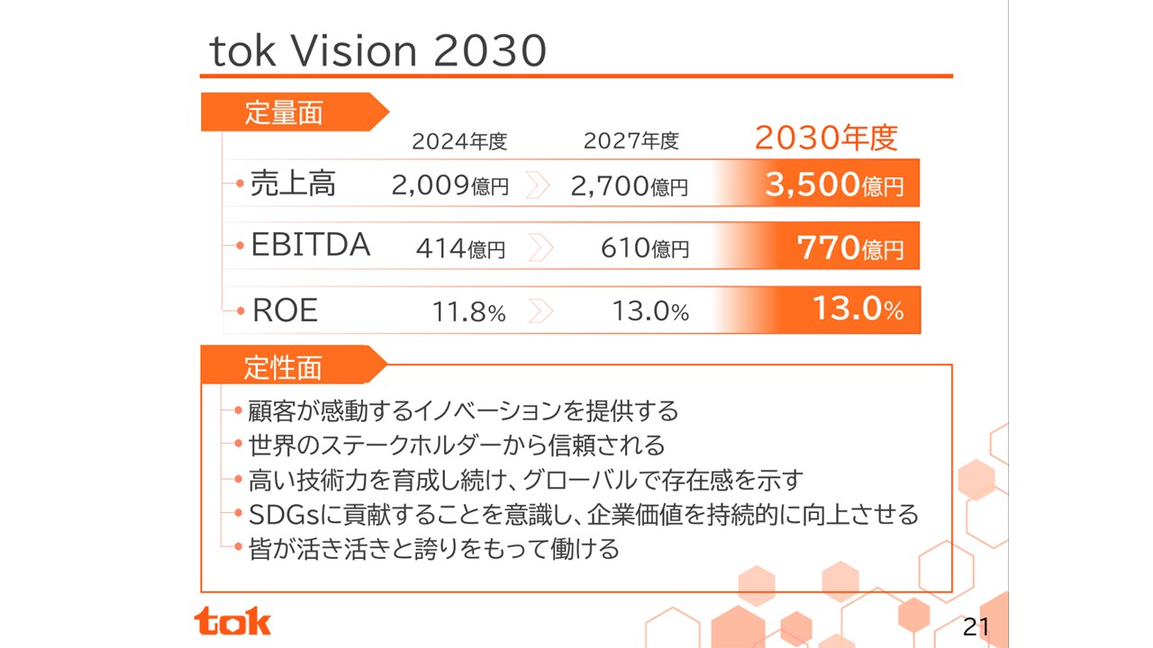 当社グループの2030年のありたい姿です。半導体市場の成長の波をしっかりと捉えることで、売上高3,500億円、EBITDA770億円まで事業を拡大できるポテンシャルが十分にあると考えています。また、ROEも13%まで高めていけると考えています。この2030年に向けた長期ビジョン「tok Vision 2030」からバックキャストして策定した3か年中期経営計画「tok中期計画2027」を本年よりスタートさせました。定量目標は売上高2,700億円、EBITDA610億円、ROE13%です。