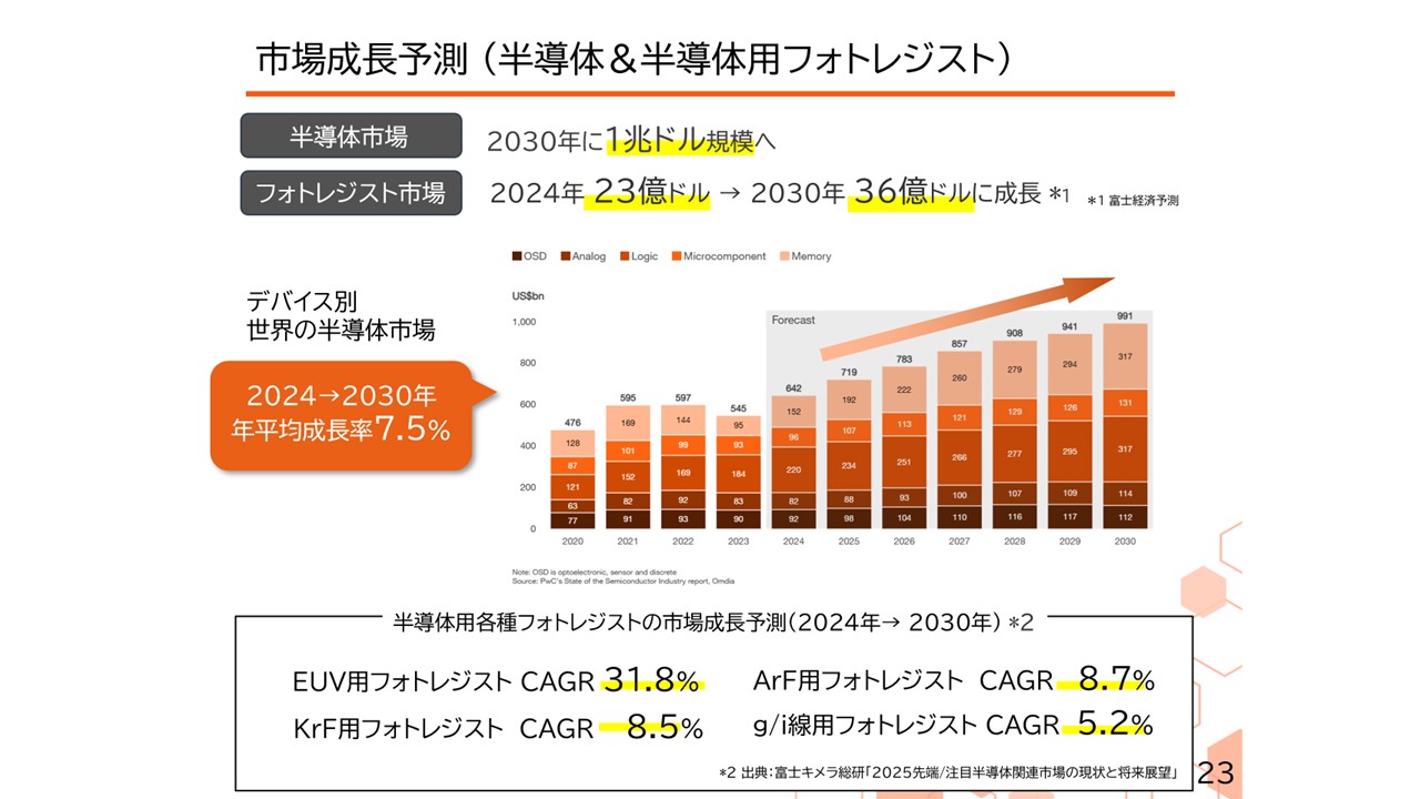 今、前工程のレジストでEUVやArF、KrF、i線用フォトレジストといったものをご説明しましたが、スライド23ではそれぞれのレジスト市場の成長予測が載っています。2024年から2030年にかけて、特にEUV用フォトレジストでは年率31%超の成長が期待されています。我々もEUVレジストのサプライヤーの1つとして、大手半導体メーカーにも採用されており、今後も成長が続くと思います。また、それ以外のArFでも8%、KrFでも8%、g/i線用でも5%ということで、引き続き堅調な成長が期待できる分野であると考えています。