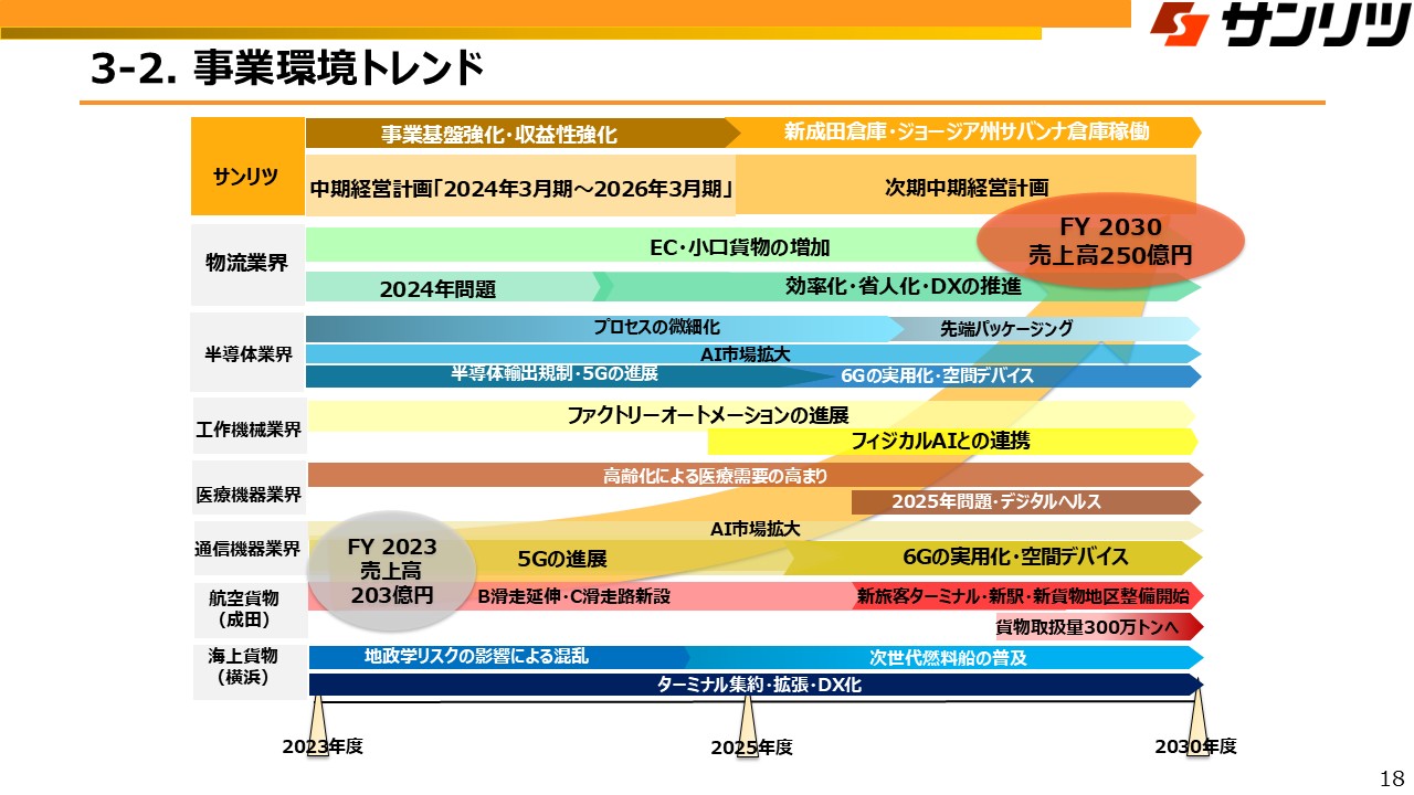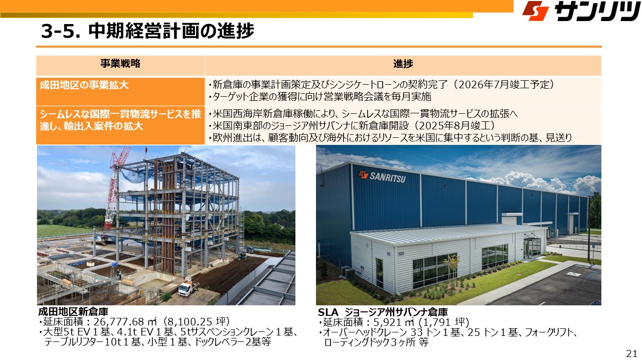スライドの下から2番目の成田航空貨物については、2029年を目途に成田空港では第3滑走路の新設が計画されています。第3滑走路の新設に伴い、貨物の取扱量が現在の1.5倍になると見込まれています。そのため、成田地区に大型の物流施設が建設されるというニュースも聞こえてきている状況です。その中で当社が2026年7月に成田地区に新しい倉庫を竣工します。今後、貨物の取扱量が増加し、物流施設も増えていくであろう成田地区で、先行したタイミングで倉庫を竣工することによる先行者利益が今後の当社の業績に大きく寄与すると高く期待しています。