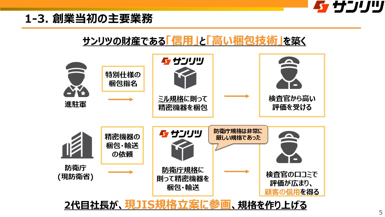 創業当初は、梱包は運送サービスのおまけ程度で、広く事業として認知されるには至っていませんでした。その中でコツコツと技術を磨き上げ、今も当社の財産である「信用」を積み重ねることによって、後にはアメリカの進駐軍や当時の防衛庁から梱包の依頼を受けるようになっていきました。そこから少しずつ当社の梱包技術が世の中に広まり、創業期に梱包事業の礎が作られました。