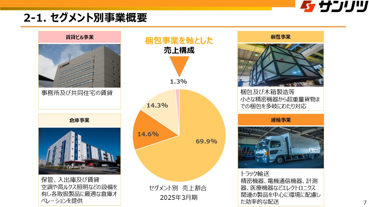開示上のセグメントは、梱包事業、運輸事業、倉庫事業、賃貸ビル事業の4事業に分類しています。梱包事業は現在でも当社の中核を担う事業で、売上全体の7割を占めています。梱包の詳細については、後ほどご説明します。