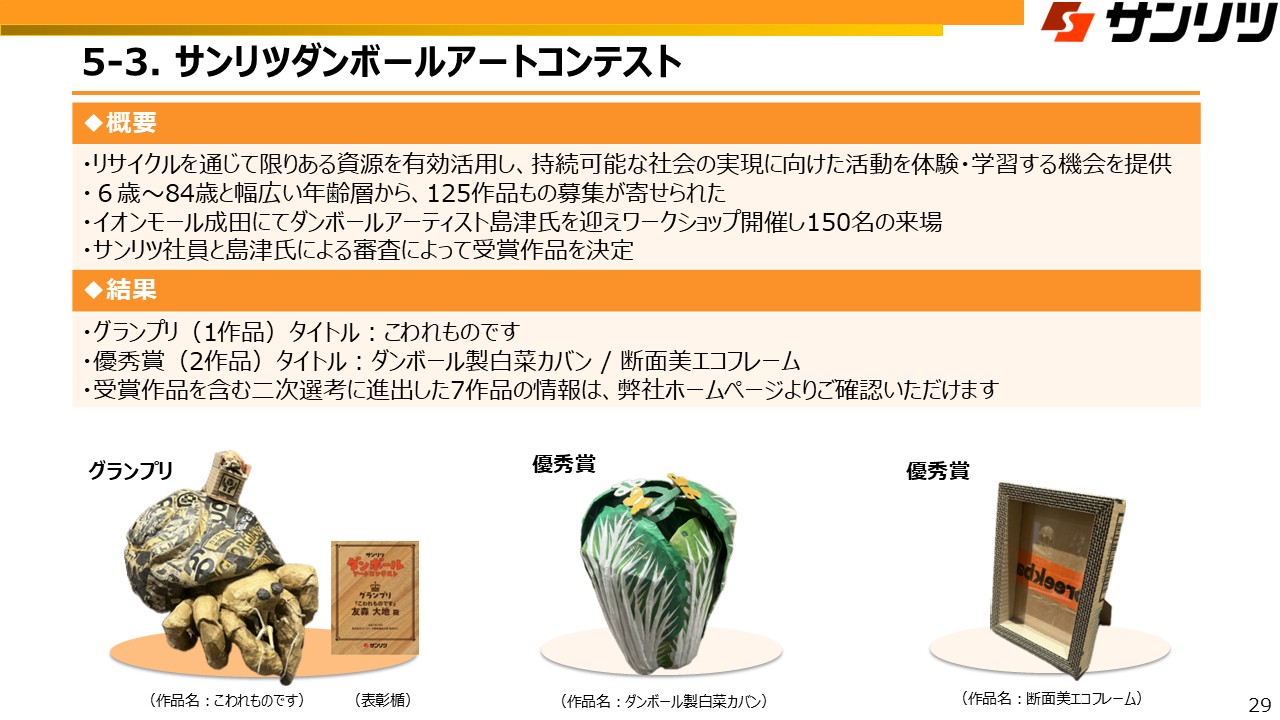今回初めて「サンリツダンボールアートコンテスト」というものを開催しました。リサイクルを通じて、限りある資源の有効活用を学ぶ機会を提供すると同時に、当社の包装設計をアピールするという思いのもと開催しました。初めての試みでしたが、全国各地から100点を超える応募をいただきました。著名なダンボールアーティストにもご協力いただいて、優秀作品の選考を行いました。今後もこのような活動を継続していきたいと考えています。