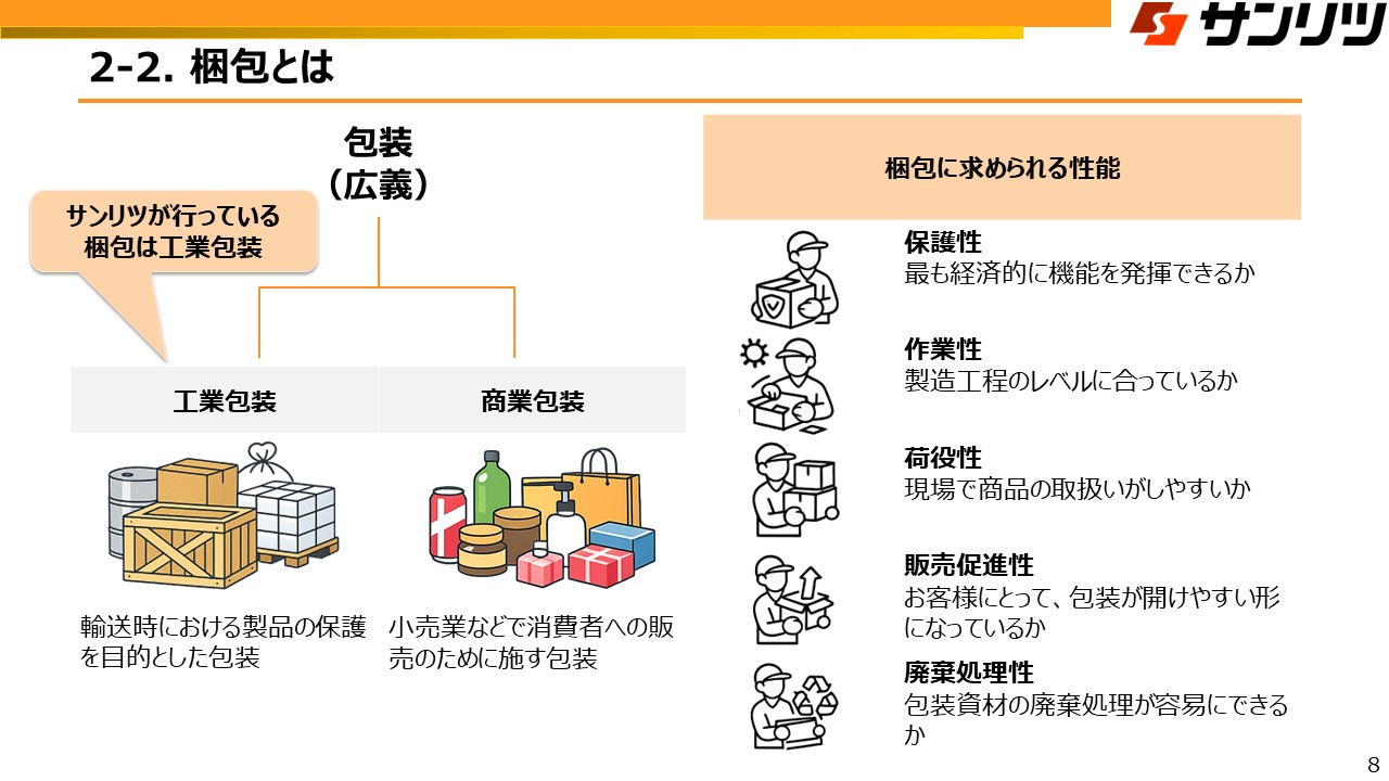 包装を大きく分類すると、工業包装と商業包装に分類されます。当社が事業として行っているのは、工業包装と呼ばれる部分で、主に企業様向けの輸送時における製品の保護を目的とした包装です。当社が梱包を行う上で最も重要であると考えているのが、梱包設計の部分です。スライド右側に記載の通り、設計を行っていく上では、製品の保護性に加え、作業性、お客様のもとに届いた後の荷扱いのしやすさ、廃棄の処理性など、あらゆる部分にお客様のご要望と製品の特性を反映して梱包設計を行うことが非常に重要であると考えています。