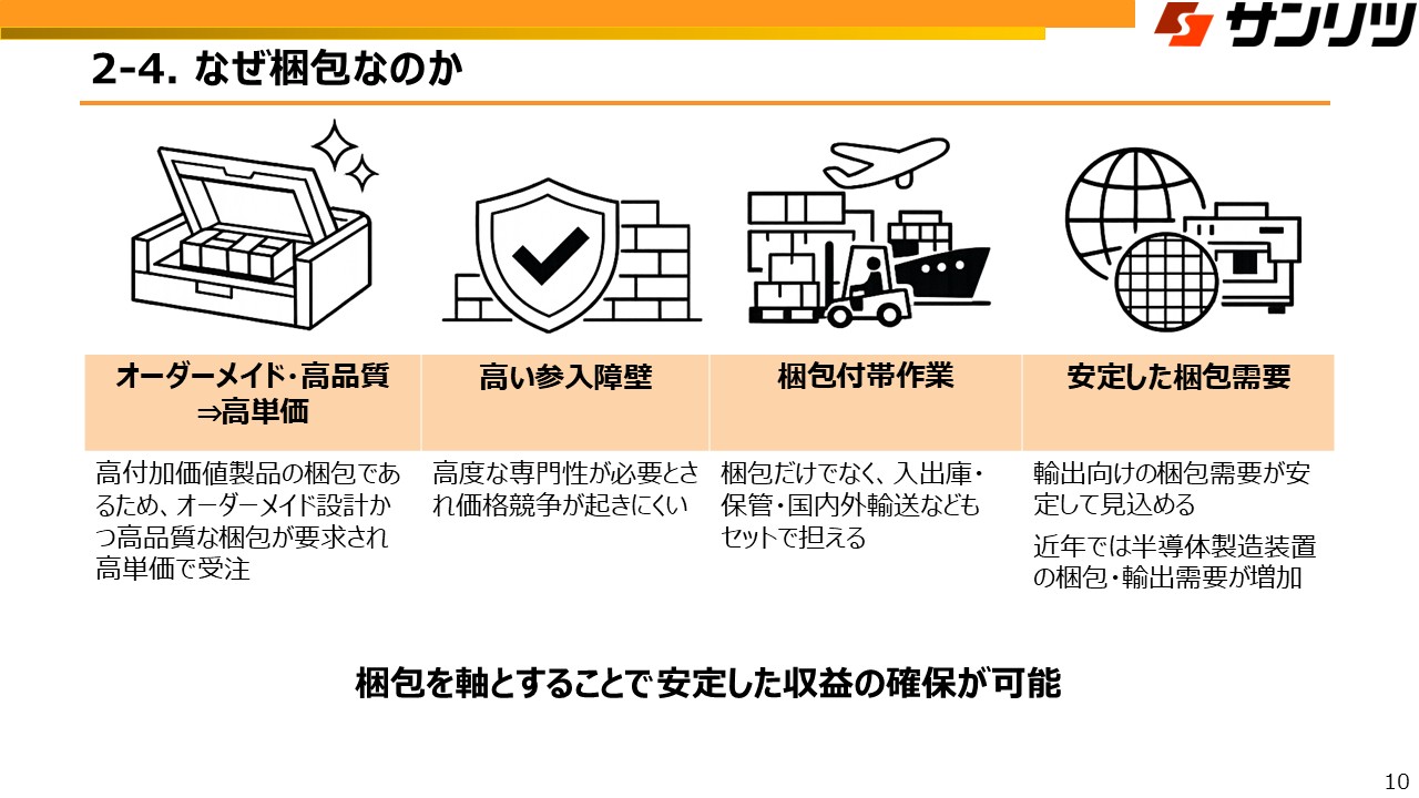最後に4点目は、安定した梱包需要が見込めるためです。当社は輸出向けの梱包を得意としています。輸出向けの梱包の需要は安定的に推移しており、当社を支える1つの大きな基盤となっています。以上の4点の理由から、当社は梱包を事業の中核にすることで、これまで安定した収益の確保を実現してきました。