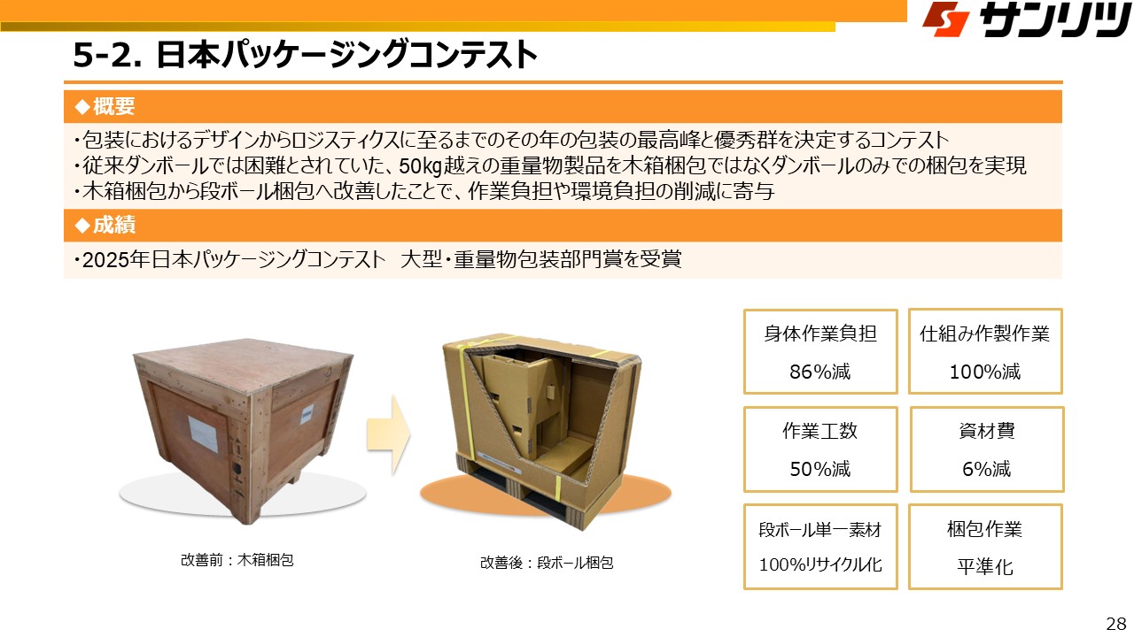 包装改善の事例として、スライドは昨年の日本パッケージングコンテストで受賞した製品です。木箱から強化ダンボールに切り替えた梱包改善です。木箱から強化ダンボールに変更することで、環境面での貢献も非常に大きな改善ですが、作業をされる方の身体的な負担を大幅に軽減することができたという部分で、非常に大きな改善であったと考えています。梱包会社としては環境面だけでなく、工数や負担も意識した改善を今後も続けていきたいと考えています。
