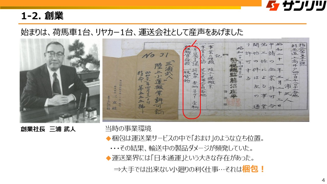 当社は創業以来、高い梱包技術を事業の中心として展開してまいりました。しかし、今後さらに企業として成長を図るためには、梱包だけにとどまるのではなく、梱包を軸に物流領域の中で領域拡大を図る必要があると考え、現在事業を展開しています。