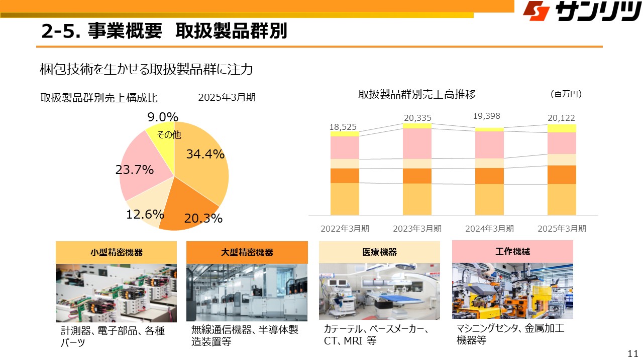 当社は梱包技術を生かした取扱製品群に注力しています。主に小型精密機器、大型精密機器、医療機器、工作機械が中心となります。スライド右上のグラフが取扱製品ごとの構成および推移を表しています。グラフの上から2番目(ピンク色の部分)が工作機械の取扱状況を示しています。工作機械は製品1台あたりの重量が10トンを超えるほどの超大型の製品となっており、当社の売上に与える影響も非常に大きな製品となっています。一方で、工作機械は業界特性として、シクリカルな動きを見せる傾向が強い製品群でもあります。そういった意味では、当社としても複数の製品群をターゲットとすることで、リスクを最小限にすべく努めています。
