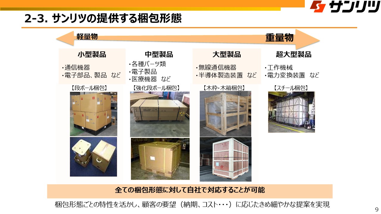 代表的な梱包形態はダンボール梱包、強化ダンボール梱包、木枠・木箱梱包、スチール梱包と多岐にわたっています。それぞれの梱包形態に強みと弱みがあるため、梱包する製品の特性に加え、お客様が梱包に対して何を一番求めているか(コスト、納期、海外に持っていった後の保管状況など)によって、選択すべき形態は変わります。当社は全てを自社で対応することが可能であり、お客様の1つ1つのご要望に対して、きめ細やかなご提案をすることができる点が当社の大きな強みであると考えています。