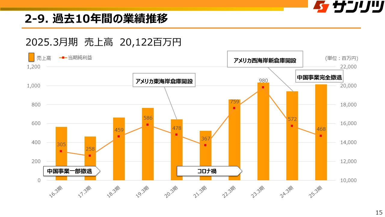 今期が中期経営計画の最終年度です。当初今期は、売上高220億円、営業利益11億円、営業利益率5%を経営目標としてスタートしました。今期の予想はスライドのグラフの一番右です。売上高210億円、営業利益9億5,000万円ということで、残念ながら当初掲げた経営目標には届かない見通しとなっています。大きな要因は、当初の計画では海外事業においてヨーロッパへの進出を折り込んでいましたが、お客様の動向に加え、当社の海外事業におけるリソースを一旦アメリカに集中するという判断のもと、ヨーロッパへの進出を見送りました。アメリカのジョージア州サバンナの倉庫建設を決め、投資戦略を変更しました。サバンナの倉庫を大きくしたことが売上・利益に寄与するのが来期以降の見通しであるため、それが当初計画を大きく下回る要因となっています。