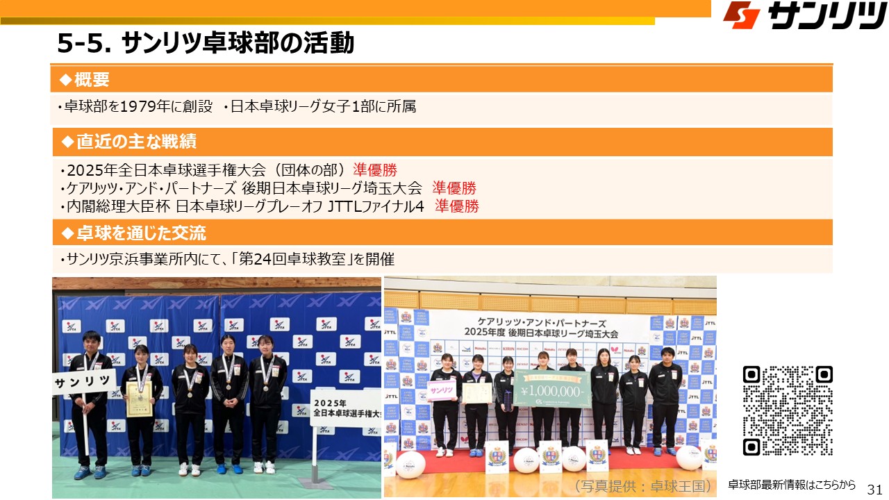 当社の女子卓球部は日本卓球リーグ女子1部に所属しています。今期は主要な大会において準優勝と惜しい結果となりましたが、選手全員が日々奮闘してくれています。また、地域の小中学生を集めた卓球教室を定期的に開催しています。今後も卓球部の活動を通じて、地域貢献、社会貢献に取り組んでまいります。