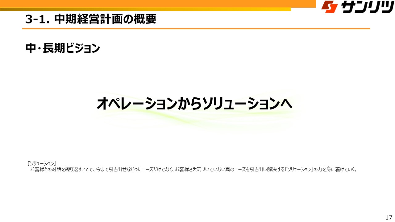 当社は中長期ビジョンとして、「オペレーションからソリューションへ」というスローガンを掲げています。当社は78年間、オペレーション力を磨いてきました。お客様からも当社のオペレーションは高くご評価いただいています。一方で、業界内の競争を考えるとオペレーションだけではなく、そこから1つ前に進んでいく必要があると考えます。お客様から真の意味で選んでいただくために、これまでのオペレーションという受け身の形から、自らお客様の問題課題に気付き、それに対する解決策をご提案することで本当の意味でお客様の戦略的パートナーになれると考えています。そういった存在を目指そうという思いから、このスローガンを掲げて事業を進めています。