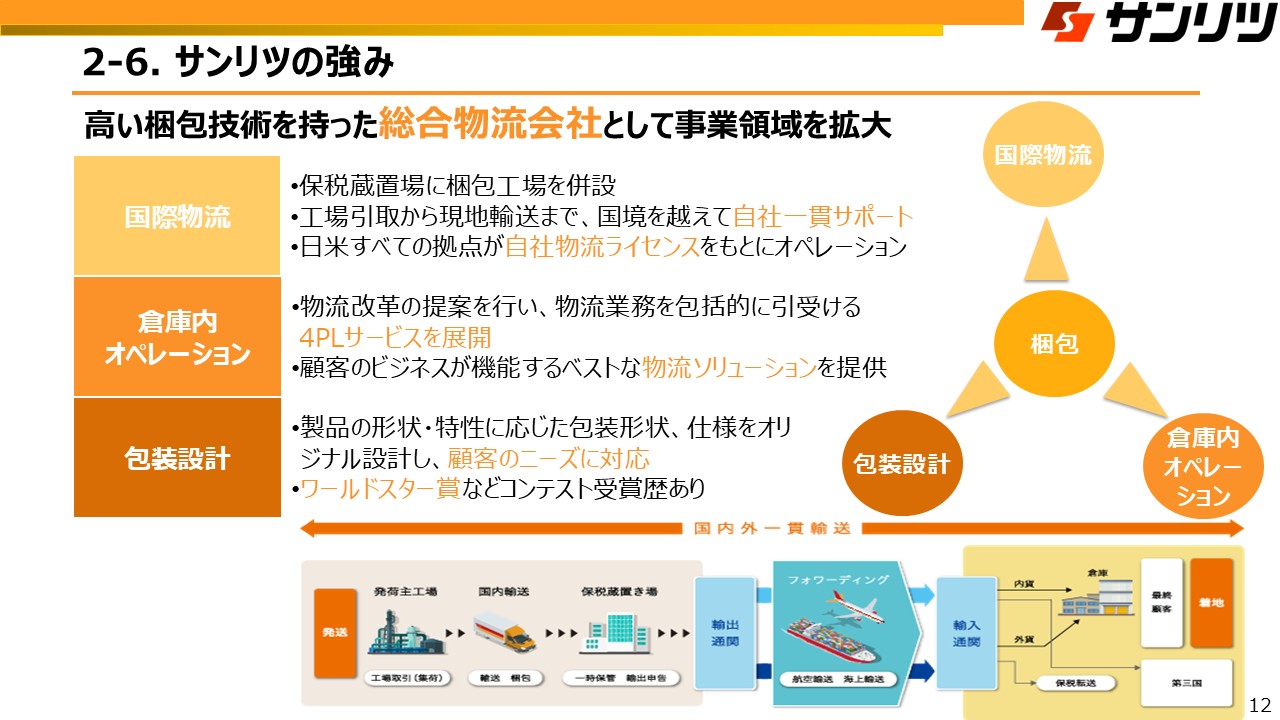 2点目は、倉庫内のオペレーションです。当社は梱包を軸に始まった会社ですが、倉庫内のオペレーションについても非常に力を入れてきました。お客様に対して物流改革の提案を行い、物流業務を包括的に引受ける4PLサービスの展開に取り組んでいます。
