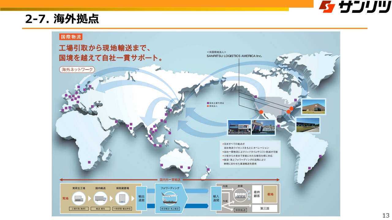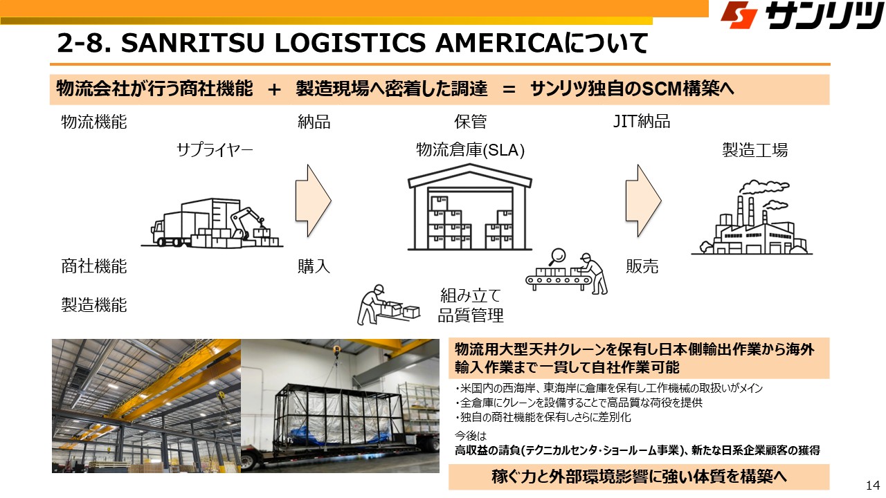 今後アメリカにおいては、倉庫内の一部をテクニカルセンター、またはショールームという形で活用できないかを検討していく他、新たな日系企業の業務獲得にもしっかりと取り組んでまいりたいと思います。