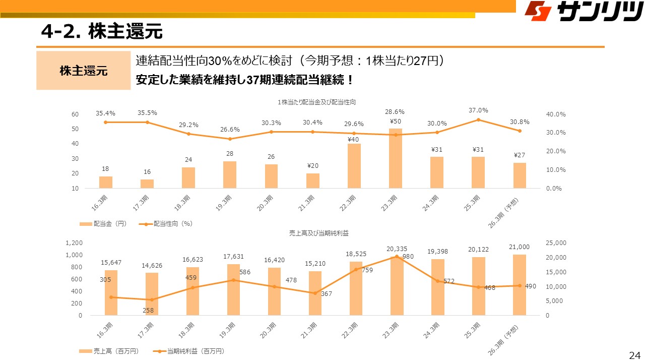 当社は収益を株主の皆様に還元することを経営の最重要課題として捉えています。連結配当性向30%を基本として、現在検討を行っています。今期の配当は、一株あたり27円を予想しています。当社は安定した業績を継続するという思いの中で、37期連続で配当を継続しています。今後も収益を向上させながら、株主の皆様に還元できる形を目指していきたいと考えています。