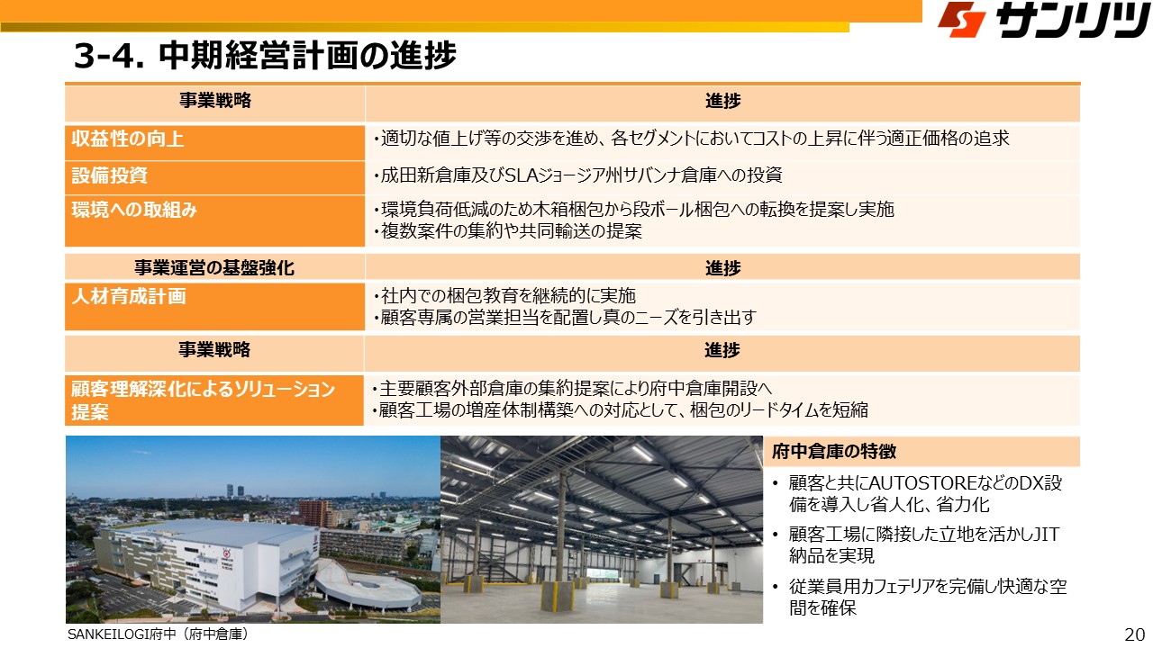 柴本現在、新しい中期経営計画を策定中で、現在では2026年5月を目途に資料を発表する予定です。新しい2つの倉庫に加えて、当社は既存の取引先として非常に優良なお客様を多く持っています。その中で業務を拡大していくことで、まだまだ利益率を伸ばせる余地があると考えています。具体的な目標については、次の中期経営計画を発表する際にご説明できればと思います。