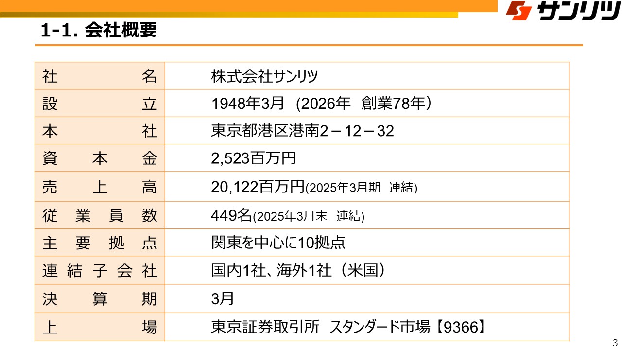 当社は1948年3月に設立し、今年で創業78年を迎える物流会社です。連結売上高は200億という事業規模です。従業員数は449名で、契約および派遣社員を合わせると約1,000名となります。主要拠点は関東を中心に10拠点、連結子会社は国内に1社、海外はアメリカに1社となっています。